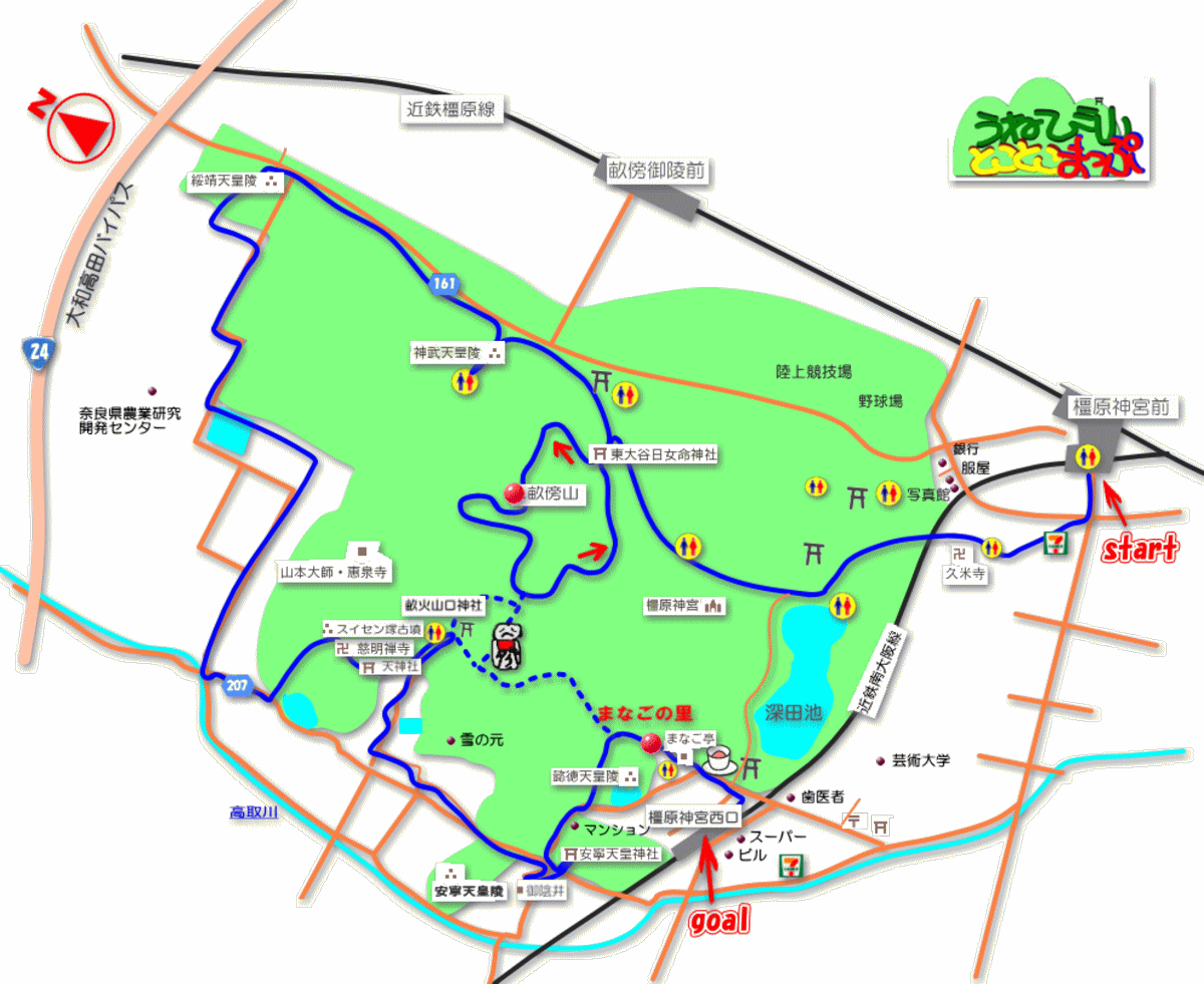 大和三山(畝傍山・耳成山・香具山)は万葉集の時代から紹介されています。その一つ、まなごの里を抱く畝傍山には第一代じんむ天皇、二代すいぜい天皇、三代あんねい天皇、四代いとく天皇のそれぞれのお墓があります。ハイキングコースとして散策してみませんか^^