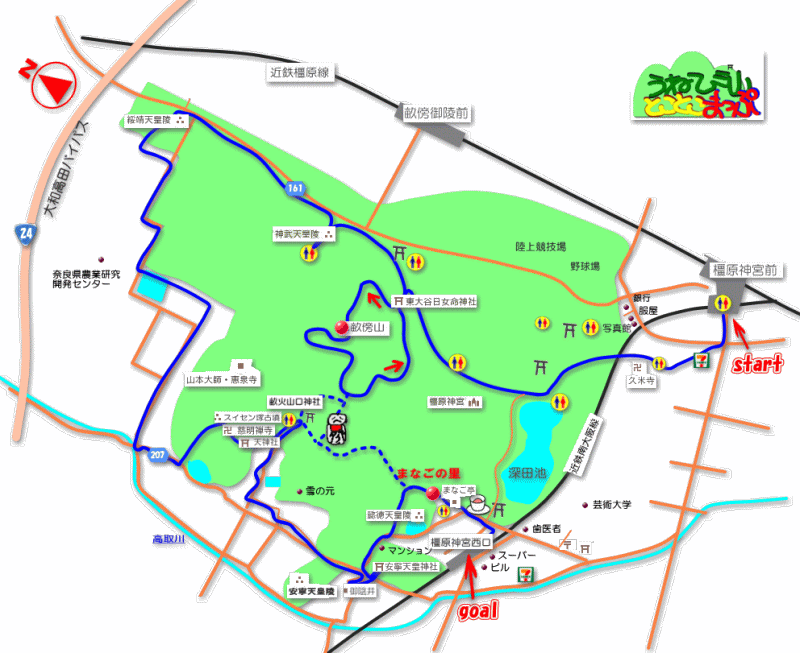 青い破線は道が付いています。お急ぎの場合、畝傍山々頂から畝火山口神社かまなごの里に抜ければ良いでしょう